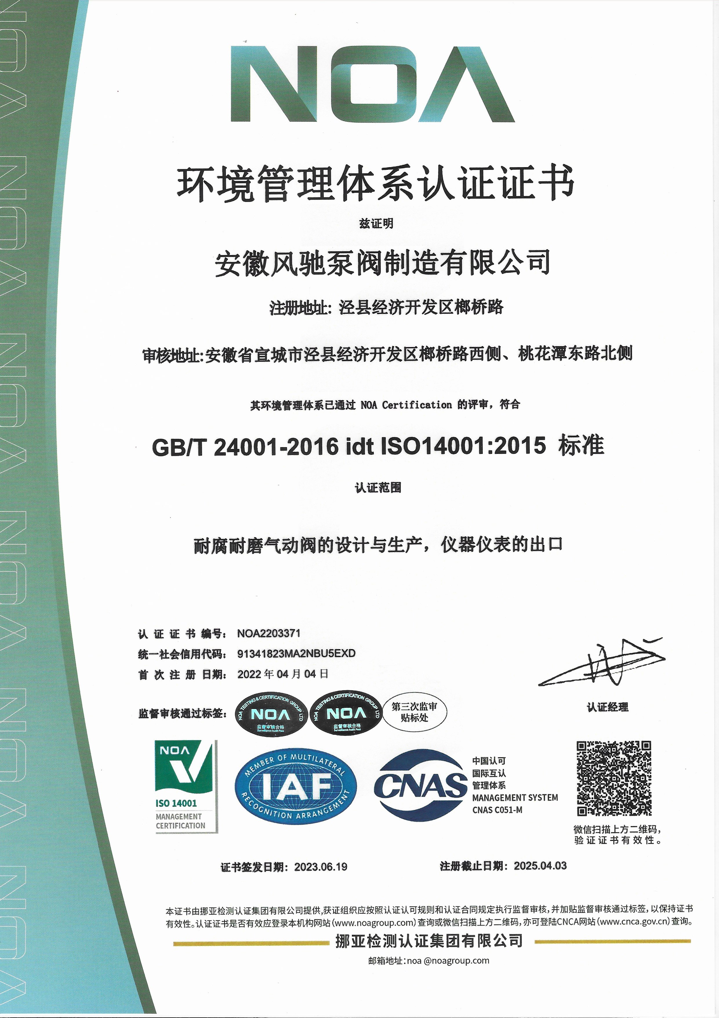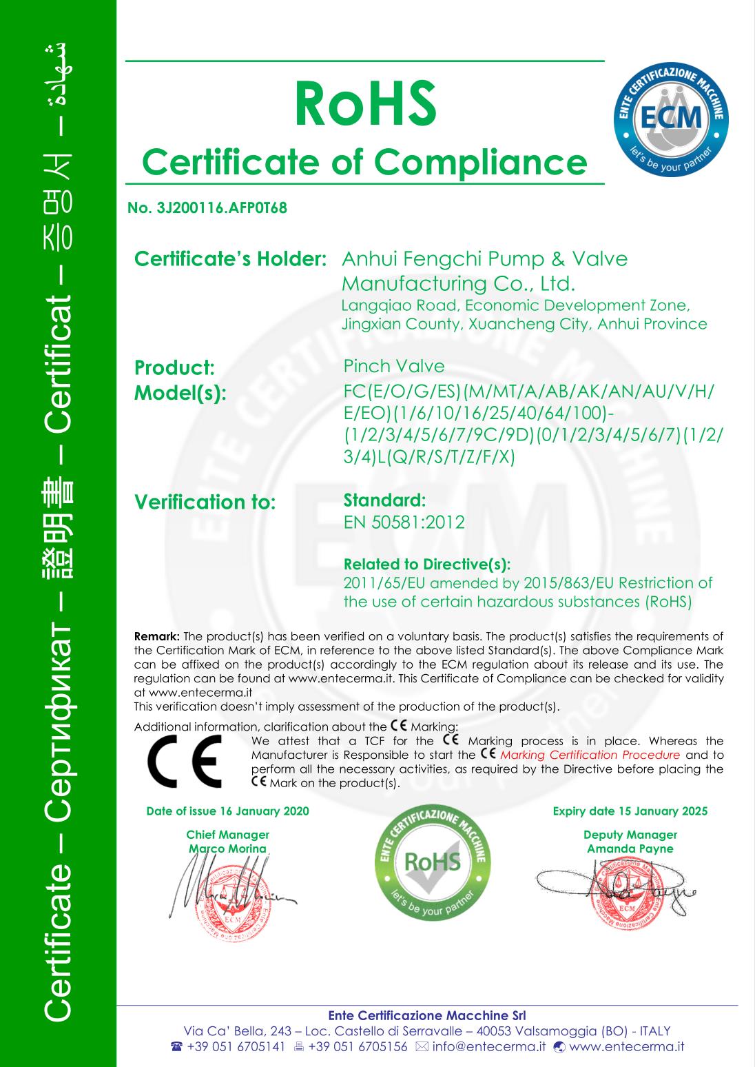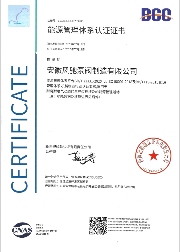 Anhui Fengchi Pump and Valve Manufacturing Co., Ltd. har successivt bestået ISO9001-2015 kvalitetsstyringssystemcertificering, ISO14000 miljøledelsessystemcertificering, ISO45001 arbejdsmiljø- og sikkerhedsledelsessystemcertificering, EU CE-certificering, Rohs-certificering.