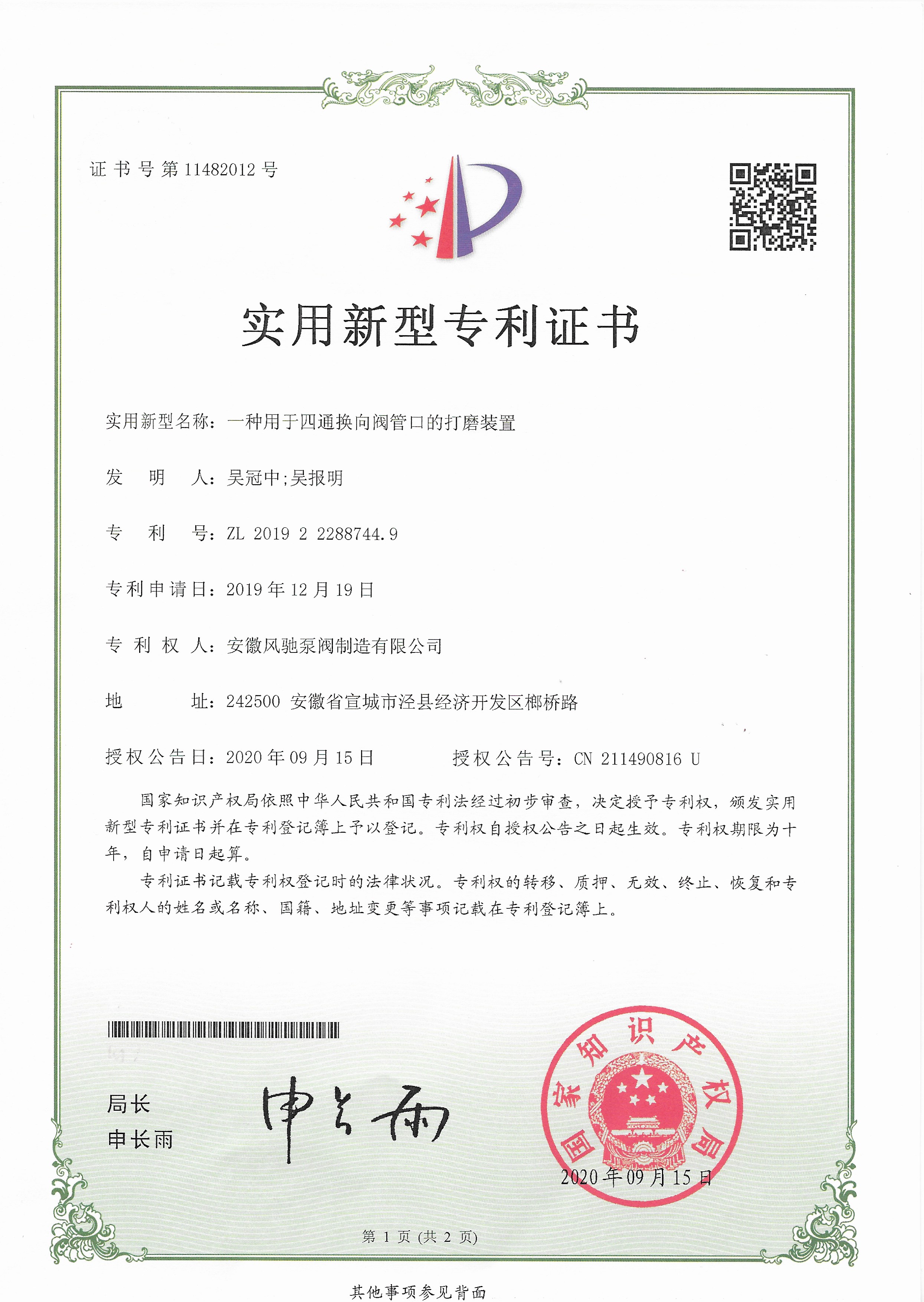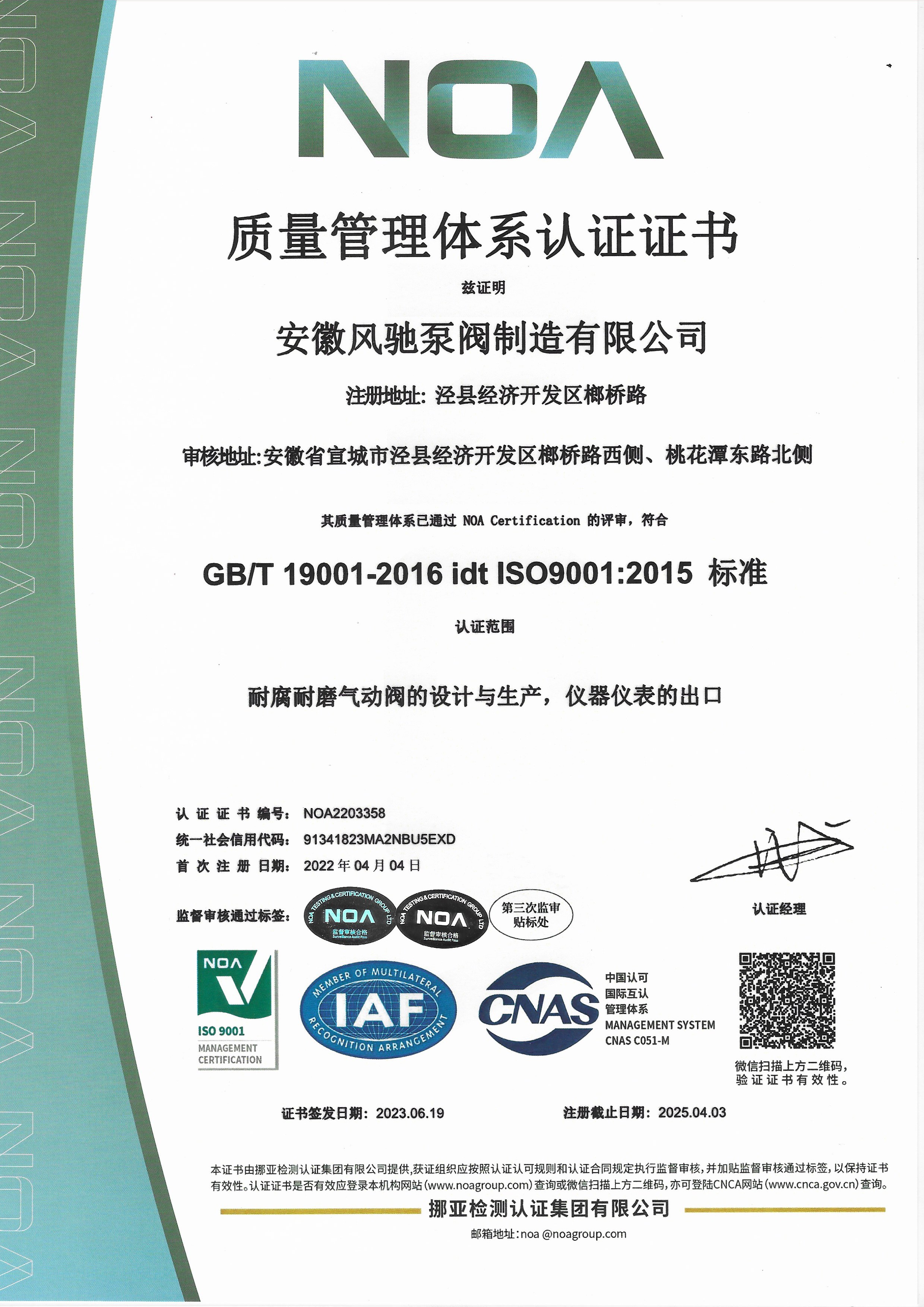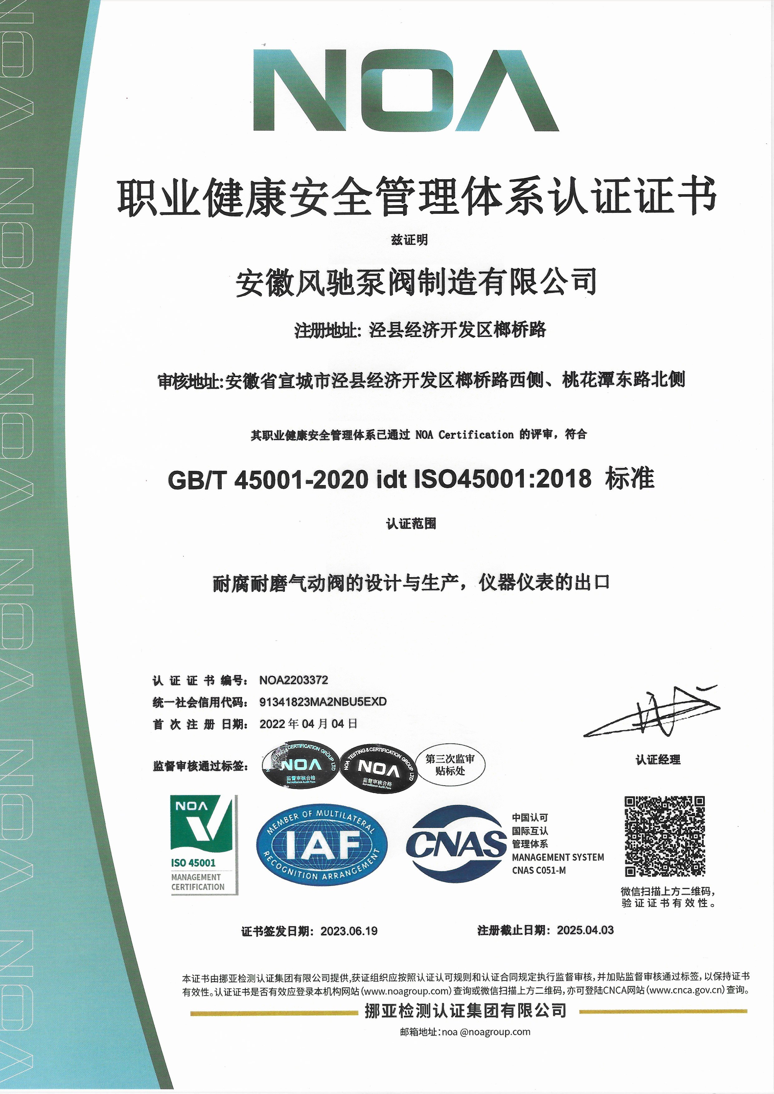 Anhui Fengchi Pump and Valve Manufacturing Co., Ltd. har successivt bestået ISO9001-2015 kvalitetsstyringssystemcertificering, ISO14000 miljøledelsessystemcertificering, ISO45001 arbejdsmiljø- og sikkerhedsledelsessystemcertificering, EU CE-certificering, Rohs-certificering.